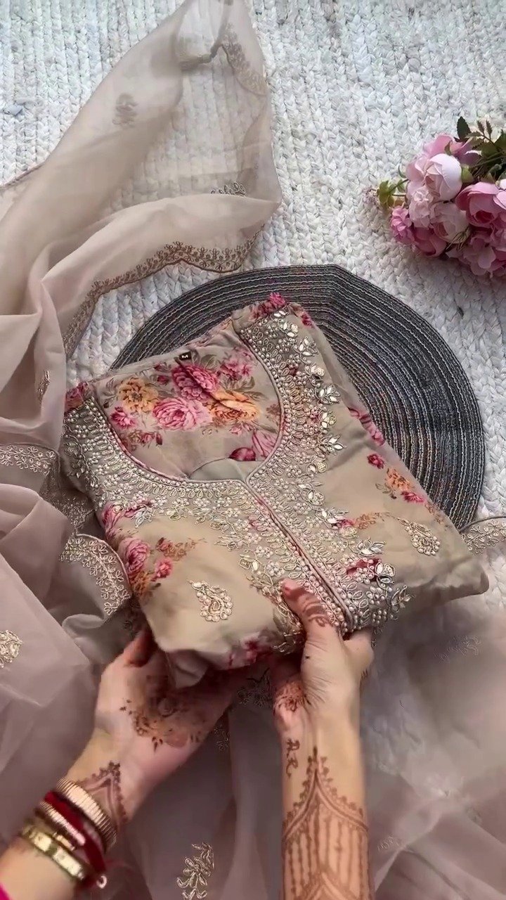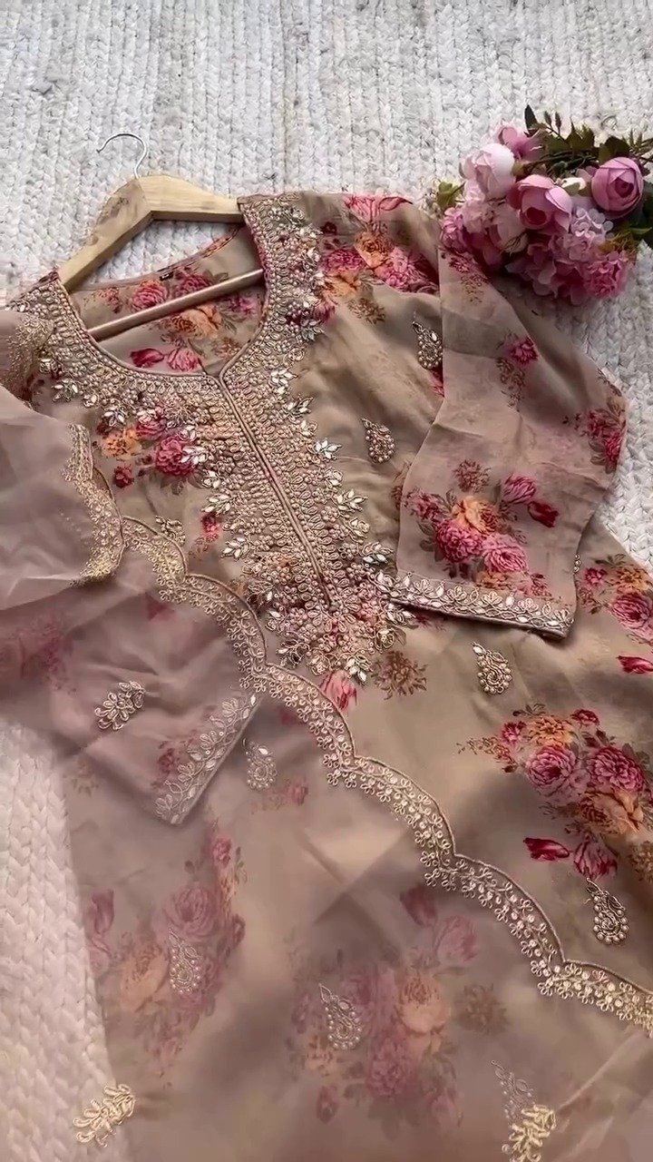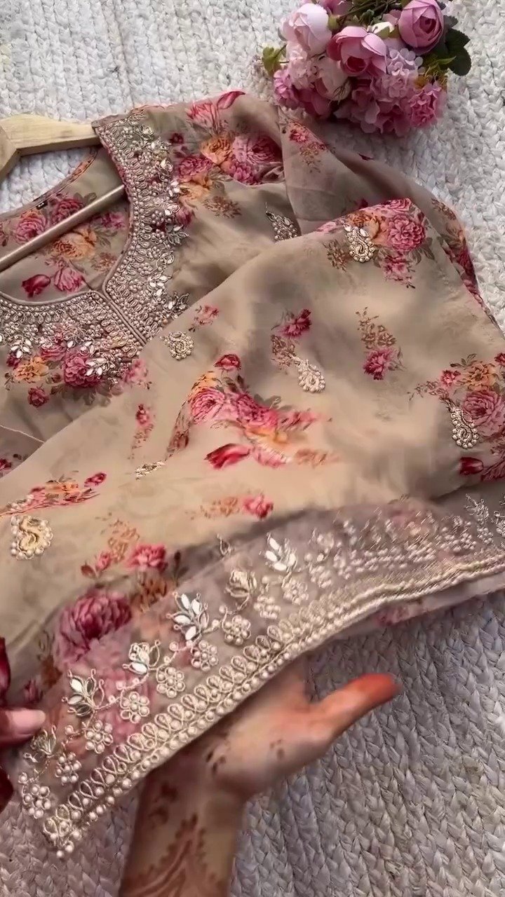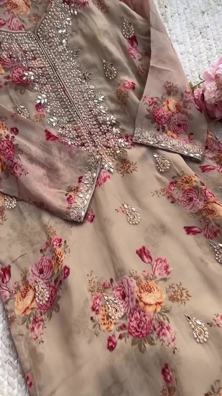 brown colour Premium Kundan Organza Embroidered Suit Set for women
